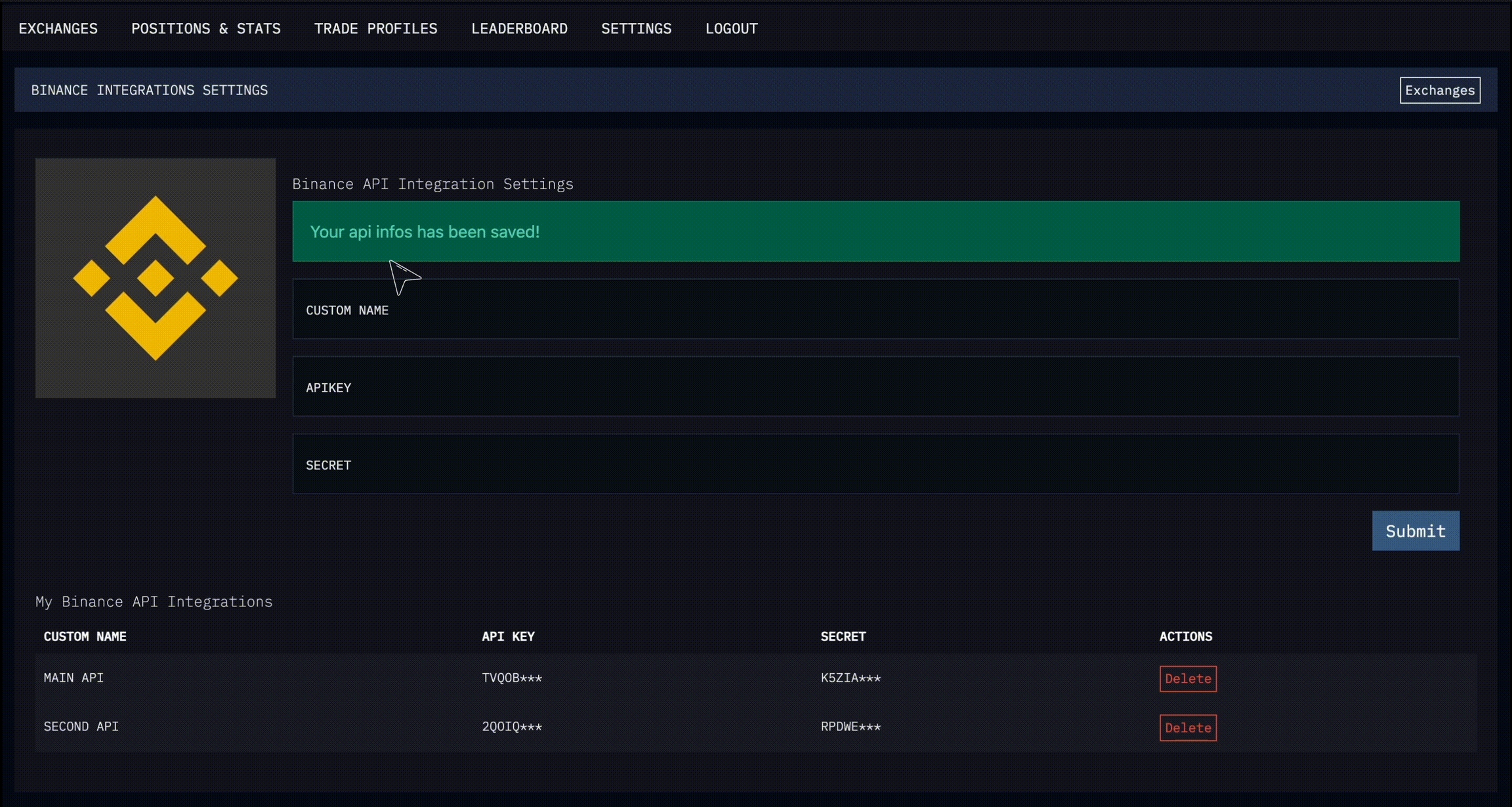 On this screen, you will be able to see your previous exchange integrations or make new integrations.