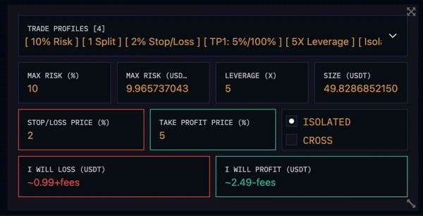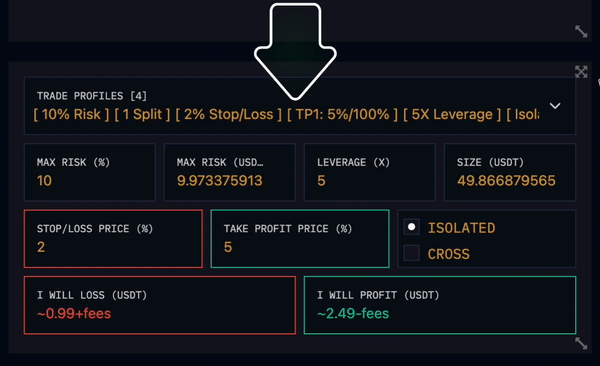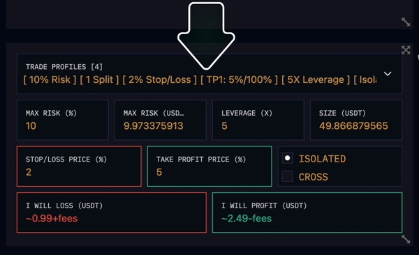 You can temporarily change the values in your trade profile; you can update your maximum risk in % or USDT, change your leverage level, order size, Stop Loss and Take Profit percentages. You can also specify whether you want to enter Isolated or Cross in this area.