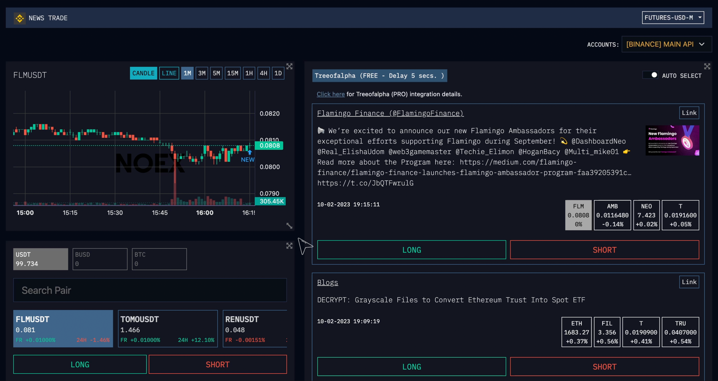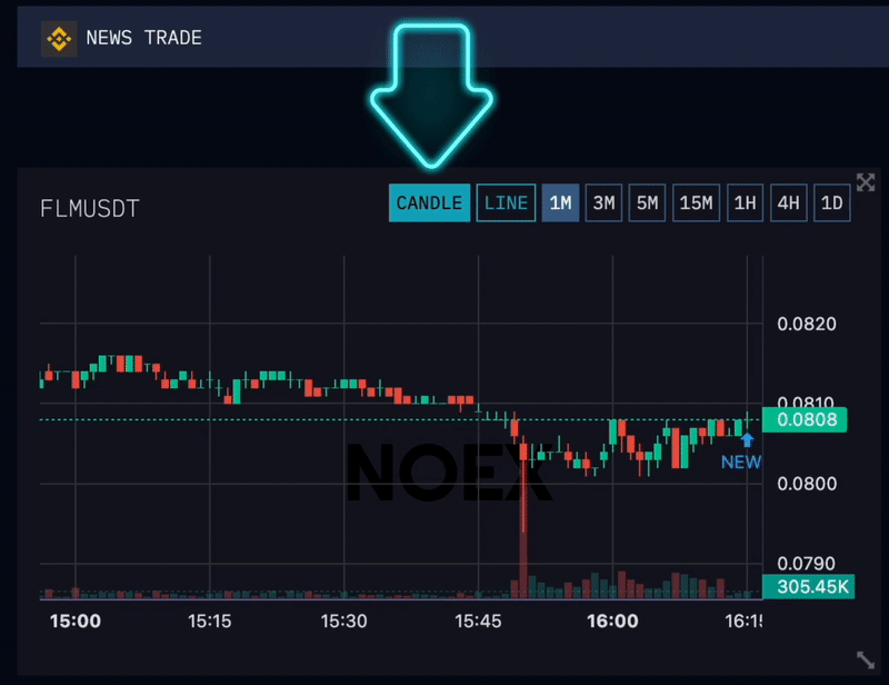 In the top left section you can see the chart of the selected pair. On this chart you can see information such as price information, volume, as well as the price/time points of incoming news.