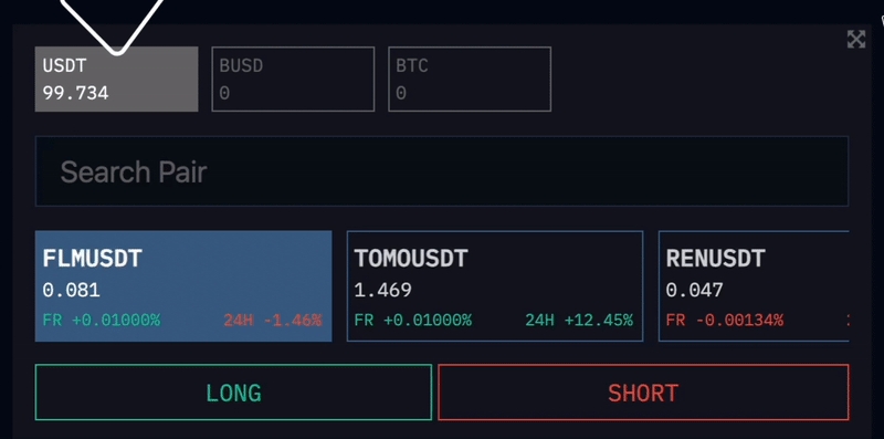 Below that, you can see the sections showing your balance and the pairs you can select by clicking below. There are also details such as instant price information, daily price change and Funding Rate on the buttons of the pairs.
